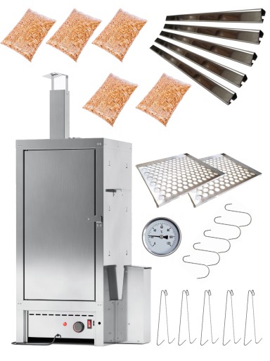 - Kupujesz kompletny zestaw który pozwala na rozpoczęcie wędzenia od razu po wyjęciu z pudełka. W zestawie jest wędzarnia z generatorem dymu, misa ociekowa, drążki, dwie półki (demontowalne), zestaw haków do mięs i ryb, a także duży zapas zrębków na kilkadziesiąt godzin wędzenia!