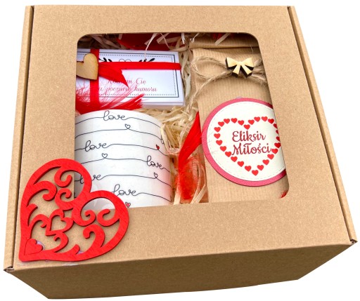 - całość zapakowana w pudełko - eko box z czerwonym serce.