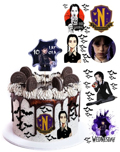 JADALNY OPŁATEK NA TORT URODZINOWY POSTACIE WEDNESDAY 6szt 9cm + TOPPER