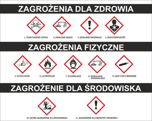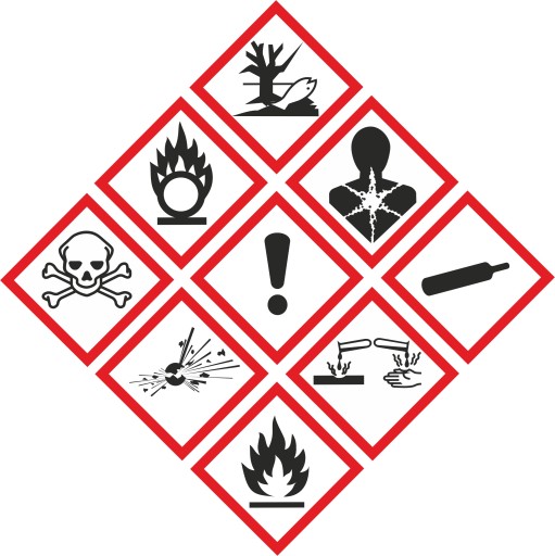 Piktogramy CLP (GHS) określają rodzaj zagrożenia. W Unii Europejskiej normy GHS zostały wprowadzone i przyjęte przez Rozporządzenie CLP (Classification, Labelling and Packaging).