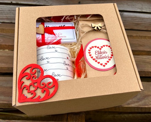 - całość zapakowana w pudełko - eko box z czerwonym serce.