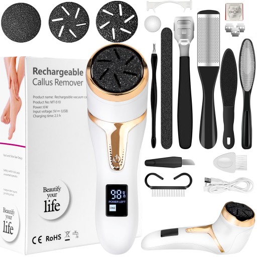 Elektryczne urządzenie do usuwania zrogowaciałego naskórka, które skutecznie usunie suchą, martwą i popękana skórę, a Twoje stopy staną się miękkie i gładkie. Elektryczny pilnik do pięt sprawdza się fenomenalnie i sprawi, że pedicure stanie się niezwykle przyjemną oraz łatwą w wykonywaniu czynnością! W zestawie znajdują się wszystkie potrzebne elementy, aby od razu móc korzystać w domowego spa!