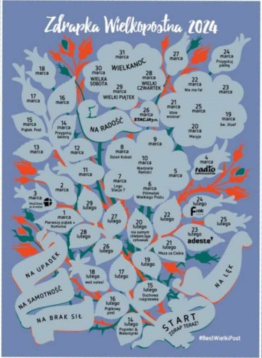 Zdrapka Wielkopostna to 40 ćwiczeń dla ducha i ciała przeznaczonych na Wielki Post, umieszczonych na papierowej planszy zakrytej zdrapką. Pierwsza edycja zdrapki odbyła się w 2015 roku i miała kilkuset uczestników. W kolejnych latach zdrapka docierała już do tysięcy osób w Polsce i poza granicami kraju. Dotarła nawet do Kazachstanu, Chin oraz Australii. Ale najbardziej cieszymy się gdy dociera wprost do serca.