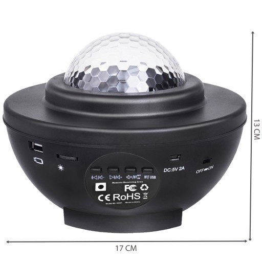 - SPECYFIKACJA - kolor: czarny; timer: tak, 1h,2h lub możliwość całonocnego świecenia; materiał: tworzywo sztuczne / metal; zasilanie: sieciowe; zasilanie pilota: baterie 2xAAA (brak w zestawie); 3 poziomy jasności; odtwarzacz muzyki: poprzez Bluetooth lub z Pendrive; kolory: RGB+white; laser imitujący zielone gwiazdki: tak; funkcje świecenia: „fade1”: wolna zmiana kolorów, „fade 2” wolna zmiana dwóch kolorów; „S+” fala (ruchomy wzór) z dowolnym kolorem bądź wszystkimi + laser; „S-” dowolne kolory bądź ich łączenie + znikające gwiazdki; przycisk mikrofon: świeci w tempie muzyki; wymiary (dł/szer/wys): 12/16/16cm; waga: 0,383kg; waga w opakowaniu: 0,556kg
