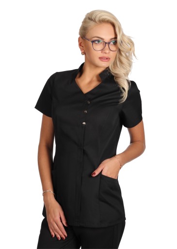 Bluza rozpinana do dołu na napy marki Schaeffer. Trzy pierwsze napy ozdobne, pozostałe kryte .W przodach modelujące sylwetkę cięcia francuskie. Mała stójka i wycięcie w serek, tworzą ciekawy dekolt. Możliwość zestawienia w komplecie ze spodniami . Krótki rękaw, dwie kieszenie na wysokości bioder (w tym miejscu proponujemy umieszczenie logo firmy, bądź personifikacji z flocka - w tym celu konieczny jest kontakt z producentem).