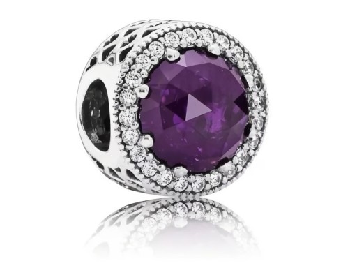 Elegancki wykonany z rodowanego srebra charms pasujący do bransolet modułowych o kształcie kółeczka, wysadzany małymi białymi cyrkoniami, oraz dużą centralnie umieszczoną wrzosową cyrkonią.