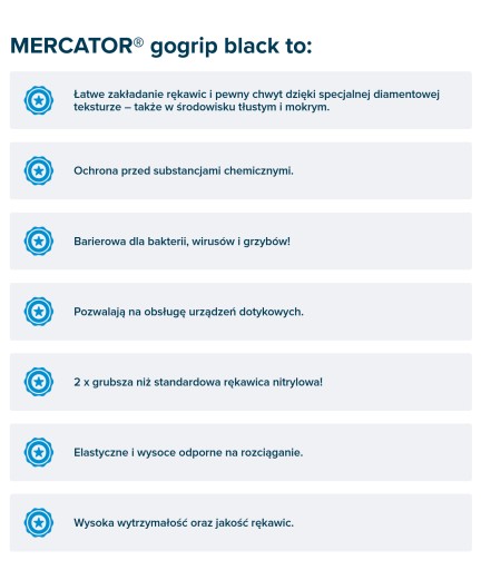 Wyjątkowo elastyczne MERCATOR® gogrip są 2 razy grubsze od standardowych rękawiczek dostępnych na rynku. Te wykonane z trwałego nitrylu rękawice, cechują się unikalną diamentową teksturą 3D, która sprawia, że Twój chwyt jest mocny i stabilny a równocześnie nie ogranicza Twojej precyzji. Oryginalna struktura MERCATOR® gogrip sprawi, że możesz obsługiwać urządzenia mobilne bez zdejmowania rękawiczek. Dodatkowo zrewolucjonizowana diamentowa tekstura 3D zapobiega potliwości dłoni w trakcie użytkowania, co podwyższa komfort pracy, minimalizując ryzyko uszkodzeń skóry dłoni.