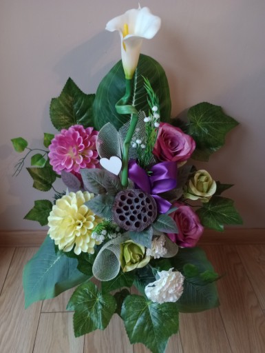 Kompozycja sztuczna (tzw. stroik, ikebana) jest wykonana z sztucznej choiny w doniczce plastikowej co daje jej stabilność.