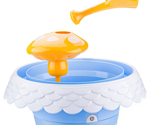 Na górze zabawki umieszczony został grzybek, który doskonale nawodni nasze roślinki. Wystarczy wlać do niego wodę aby zobaczyć prawdziwą fontannę. Zakończenie / obramówka górnej doniczki to tunel, do którego po wlaniu wody zobaczymy podobny efekt. Woda ścieknie na dół 4 otworkami i nawodni niższy poziom.
