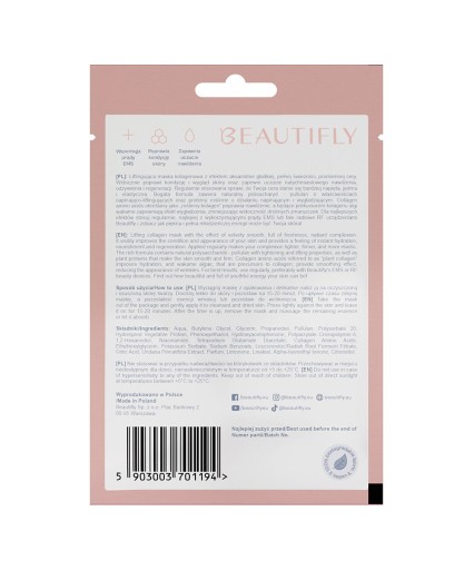 Liftingująca maska kolagenowa z efektem aksamitnie gładkiej, pełnej świeżości, promiennej cery. Widocznie poprawi kondycję i wygląd skóry oraz zapewni uczucie natychmiastowego nawilżenia, odżywienia i regeneracji. Regularnie stosowana sprawi, że Twoja cera stanie się bardziej napięta, jędrna i elastyczna. Bogata formuła zawiera naturalny polisacharyd - pullulan o właściwościach napinająco-liftingujących oraz proteiny roślinne o działaniu napinającym i wygładzającym. Collagen amino acids określany jako „roślinny kolagen” poprawia nawilżenie, a będące prekursorem kolagenu algi wakame zapewniają efekt wygładzenia, zmniejszając widoczność drobnych zmarszczek. Dla najlepszych efektów stosuj regularnie, najlepiej z wykorzystującymi prądy EMS lub fale radiowe RF urządzeniami Beautifly i zobacz jak piękna i pełna młodzieńczej energii może być Twoja skóra!