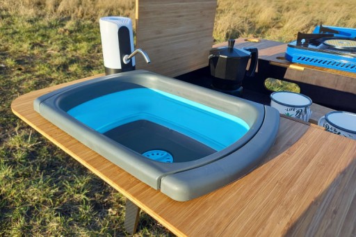 Aby zwiększyć komfort użytkowania, przy pompce do wody znajduje się otwór na zlewozmywak. Co ważne, nie musisz martwić o dobór odpowiedniego akcesorium, bo zostało ono załączone do zestawu. Zlewozmywak jest silikonowy, dlatego po złożeniu zajmuje mało miejsca i z łatwością znajdziesz dla niego miejsce w schowku.