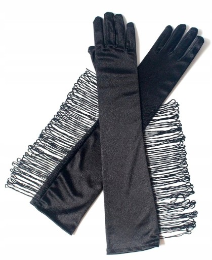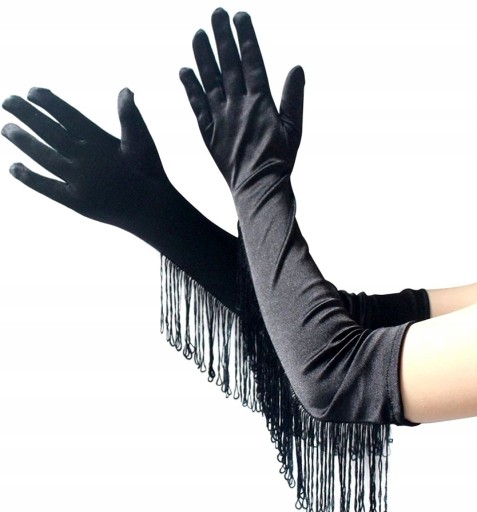 Rękawiczki satynowe damskie długie lekko elastyczne, retro z frędzlami