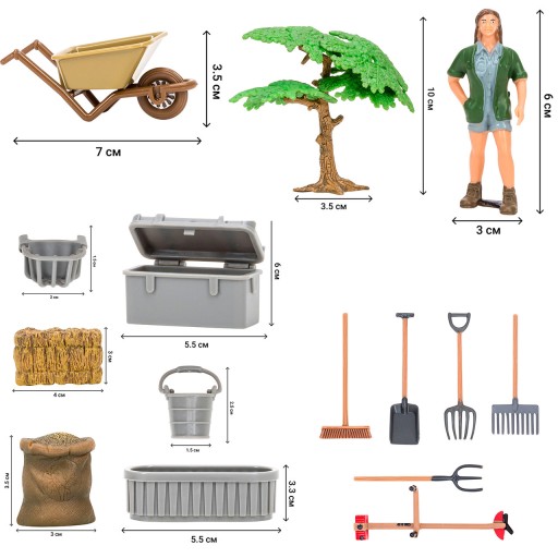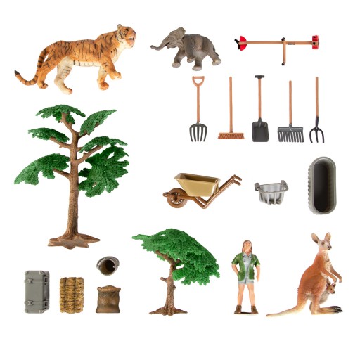 Zestaw zawiera: drzewa, taczkę, widły, łopatę, grabie, kosze, wannę, kangura, tygrysa, słonia, rolnika. Wszystkie elementy widoczne na zdjęciu.
