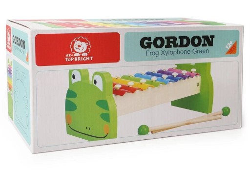 Zasada działania jest prosta – przy pomocy pałeczek uderza się w metalowe sztabki, które pod wpływem wibracji wydają dźwięk. Produkt został wykonany z wysokiej jakości, trwałego drewna oraz metalu z użyciem bezpiecznych, nieuczulających barwników. Jest to idealny pierwszy instrument dla Twojego malucha! Sympatyczna, uśmiechnięta Żabka przyniesie Twojemu dziecku dodatkową radość z zabawy. Kolory są żywe i trwałe, a grafika wiernie odwzorowuje rysunkową główkę Żabki.