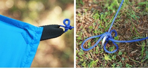2. W każdym rogu materiału oczka / uchwyty do odciągów z mocnej taśmy przeznaczone do montażu sznurków