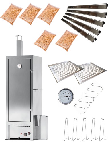 - Kupujesz kompletny zestaw który pozwala na rozpoczęcie wędzenia od razu po wyjęciu z pudełka. W zestawie jest wędzarnia z generatorem dymu, misa ociekowa, drążki, dwie półki (demontowalne), zestaw haków do mięs i ryb, a także duży zapas zrębków na kilkadziesiąt godzin wędzenia!
