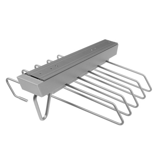Wieszak na spodnie producenta RIEX w kolorze ciemnoszarym. Wykonany jest z wysokiej jakości materiałów oraz wyposażony jest w prowadnice z mechanizmem cichego domyku. Świetnie sprawdzi się w każdej szafie czy garderobie.