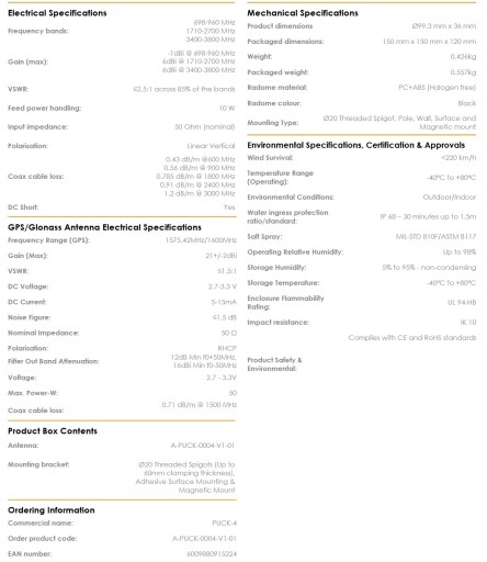 Nowa seria PUCK firmy Poynting oferuje małe anteny profilowe do użytku w IoT / M2M, inteligentnych licznikach, inteligentnych usługach użyteczności publicznej, transporcie, żegludze morskiej i rolnictwie. PUCK-4 składa się z systemu antenowego 3 w 1 w jednej obudowie, wyposażonego w 2X2 MIMO LTE i GPS / GLONASS. Anteny 2X2 Cellular MIMO (dla 2G / 3G / 4G) obsługują pasmo od 698 do 3800 MHz, w tym najpopularniejsze międzynarodowe pasma LTE. Trzecia antena to wysokowydajny, aktywny system GPS / GLONASS działający w temperaturach do -40ºC. PUCK przewyższa wydajność wielu konkurentów dzięki dbałości o projekt tej wysokowydajnej anteny. Wzorce promieniowania wszystkich elementów promieniujących zapewniają doskonałą równowagę między dookólnością, różnorodnością wzorów i dobrymi zdolnościami promieniowania na żądanej wysokości, co jest często pomijane w antenach o tak małych rozmiarach. Pomimo niewielkich rozmiarów antena ta zapewnia doskonałą wydajność, szczególnie w wyższych pasmach częstotliwości, gdzie wydajność ma kluczowe znaczenie dla przepustowości LTE i stabilności połączenia. Ta antena została zaprojektowana tak, aby oba porty LTE były podłączone do routera / urządzenia, aby zapewnić najlepszą wydajność. Zapoznaj się z innymi pochodnymi serii PUCK, które są bardziej odpowiednie do zastosowań SISO.