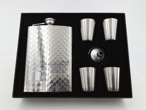 Oferta dotyczy zestawu 4 kieliszków, lejka i piersiówki. Wszystko w eleganckim pudełku. Idealnie nadaje się na prezent. Zestaw jest, praktyczny i sprawi dużo radości. Piersiówka ma pojemność 236 ml. Wymiary zestawu to 21x16,5x4,5 cm. Piersiówka i kieliszki są metalowe.