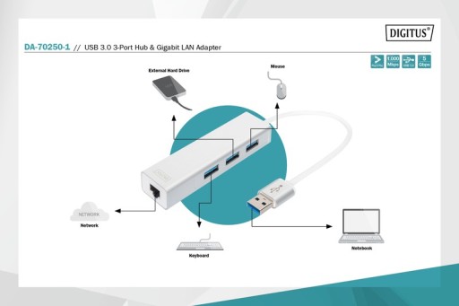 3-portowy koncentrator USB 3.0 i adapter sieci Gigabit LAN marki DIGITUS® umożliwiają podłączenie 3 dodatkowych urządzeń High-Speed USB 3.0 do urządzeń Ultrabook™, notebook, subnotebook, Macbook, Macbook Air itd. Drukarki, dyski twarde, pamięci Flash, czytniki kart, głośniki i wiele innych urządzeń można w łatwy sposób podłączyć przez interfejs USB. Dodatkowo adapter wyposaża komputer w port Gigabit Ethernet i umożliwia mu w ten sposób pracę w sieci, ponieważ wiele urządzeń mobilnych można dzisiaj podłączyć do sieci wciąż wyłącznie przez bezprzewodową sieć LAN.