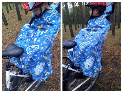 ⭐ ochroni przed zimnem/wiatrem podczas wycieczki rowerowej (ma dodatkowe, bezniklowe napki, by móc zapiąć kocyk z tyłu fotelika)