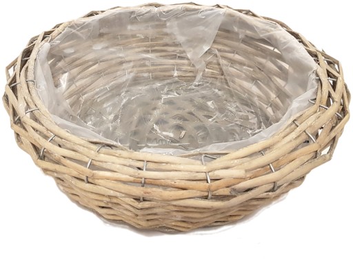 wykonany z naturalnego materiału: wikliny; rękodzieło; wiklina naturalna: kolor brązowo/szary, kształt okrągły lekko owalny; delikatnie węża się ku dołowi; w środku obszyty transparentną folią ochronną, zastosowanie dom i ogród.