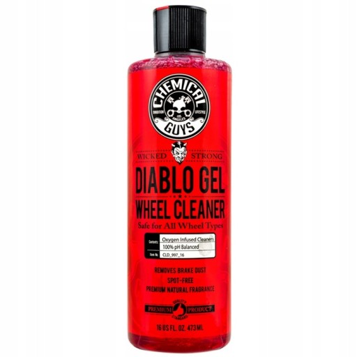 - 1 SZT. CHEMICAL GUYS DIABLO GEL WHEEL CLEANER 473ml - to produkt do czyszczenia felg, kołpaków i opon, który wykorzystuje delikatną pianę nasączoną tlenem do bezpiecznego czyszczenia powierzchni. Posiada neutralne pH i skład na bazie wody, jest niekorozyjny. Nie spływa z powierzchni i skutecznie rozpuszcza brud. Jest przyjazny dla felg lakierowanych, ze stali nierdzewnej, kompozytowych czy nawet powlekanych folią.