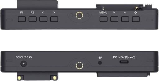 Sterowanie monitorem może odbywać się za pomocą prostych gestów lub przycisków funkcyjnych. Na górnej krawędzi obudowy umieszczono przyciski sterujące: włącznik, menu, cztery klawisze umożliwiające poruszanie się po ustawieniach oraz dwa niestandardowe przyciski funkcyjne (F1, F2). Również porty i gniazda zasilające zostały rozmieszczone w czytelny sposób. Z lewej strony znajdziemy porty HDMI (wejściowy i wyjściowy) oraz port do wpięcia zasilacza sieciowego DC in 12 V. Dolna krawędź z kolei oferuje wyjście DC out 8,4 V, gniazdo audio mini jack 3,5 mm do prowadzenia bieżącego odsłuchu oraz port USB-C / DC in 5 V. Tylna krawędź monitora posiada miejsce na akumulator NPF oraz wyjście w tym samym standardzie, przy pomocy którego możemy bezpośrednio z monitora zasilić inne urządzenie – np. transmiter obrazu czy lampę LED. W obudowie monitora znajdziemy także otwory w standardzie 1/4 cala.