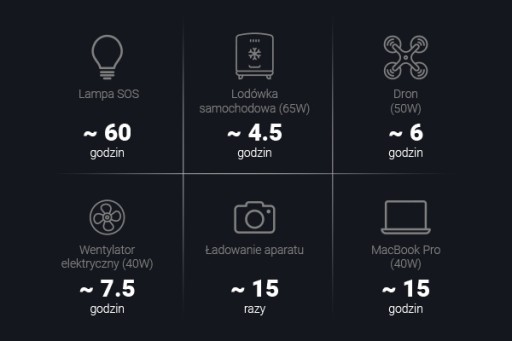 - Wyjście USB-A: 18 W: 5 V/3 A, 9 V/2 A, 12 V/1.5 A