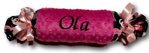 Poduszka w kształcie cukierka z haftowanym imieniem.