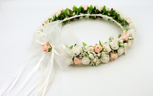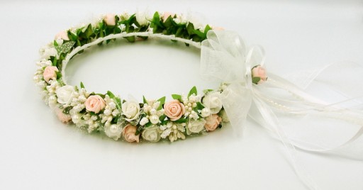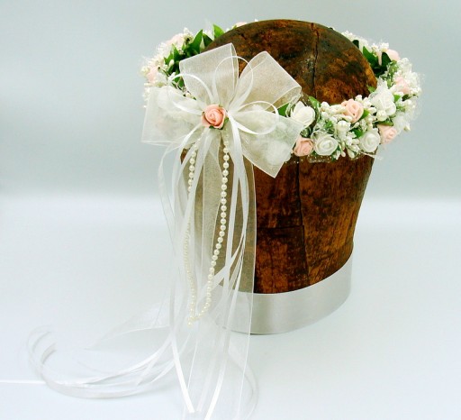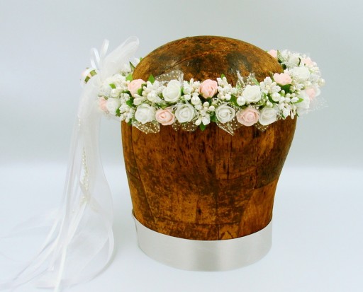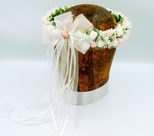 Uroczy wianek wykonany z różyczek piankowych ozdobiony białymi pręcikami i perłami.