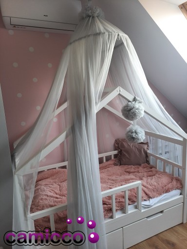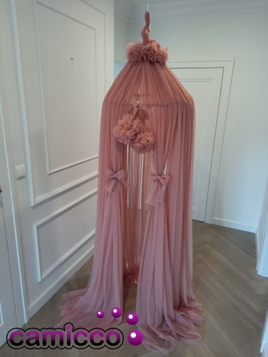 Piękny baldachim typu TIPI wykonany z tiulu szyfonowego z obręczą, 2 pomponami, 2 kokardkami + zestaw do montażu do sufitu