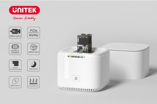 Stacja jest kompatybilna z dyskami SS2 42/60/80 mm, zarówno z kluczem M, jak i B + M. Możliwe jest stosowanie dysków o pojemności do 16 TB. Nie potrzebujesz komputera do klonowania danych między dwoma dyskami – wystarczy, ze umieścisz je w stacji. Instalacja dysków jest beznarzędziowa. Aby rozpocząć proces klonowania danych wystarczy przytrzymać frontowy przycisk minimum 3 sekundy. Postęp całego procesu widoczny jest na diodach LED. Po pół godziny bezczynności stacja przechodzi w tryb uśpienia.