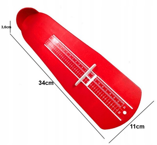 Można śmiało powiedzieć, że jest to produkt 2w1, ponieważ znajdują się na nim dwie skale. Jest to miarka rozmiaru stopy, ponieważ posiada skalę w cm, określającą długość stopy. Jest to również miarka rozmiaru obuwia, gdyż znajdziemy tu skalę dostosowaną do standardowych rozmiarów obuwia. Oczywiście należy pamiętać, że czasem producenci obuwia nie stosują się do ogólnej rozmiarówki i przyjmują własną, dlatego przed zakupem obuwia w Internecie najlepiej sprawdzać nie tylko rozmiar butów, ale i porównywać długość ich wkładki ze zmierzoną długością stopy.