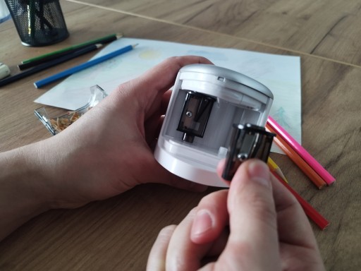 ✅ W temperówce zamontowano czujnik bezpieczeństwa, dzięki któremu temperówka nie będzie ostrzyć, gdy wyciągniemy pojemnik na strużyny.