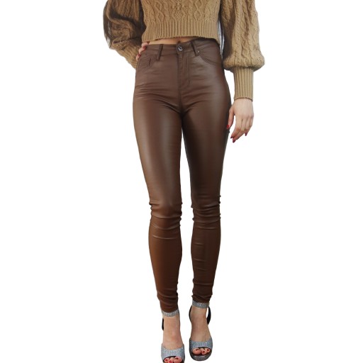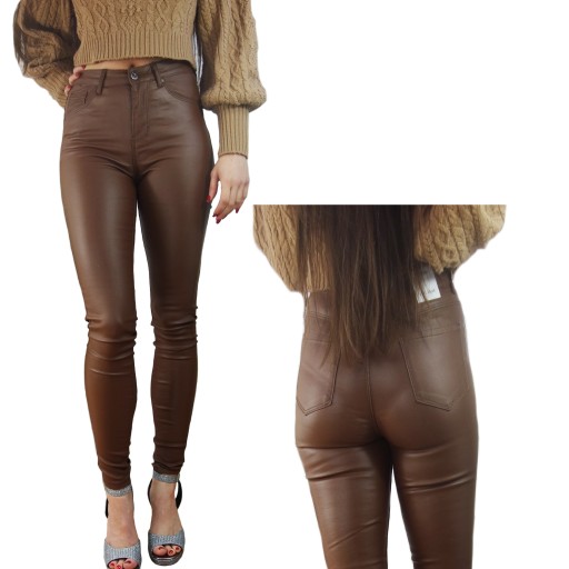Świetne spodnie woskowane imitującą skórę kolor posiadają średni stan. Świetne do sportowego obuwia ale idealnie też sprawdzą się w połączeniu ze szpilkami, dzięki swojej uniwersalności, pasują niemal do każdej stylizacji. Elastyczny materiał podkreśla kobiecą sylwetkę. Spodnie są dopasowane, rozciągają się. Podkreśl swoje kobiece kształty! Spraw, by Twój codzienny Look był niepowtarzalny. Spodnie po obu stronach posiadają kieszenie.