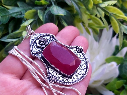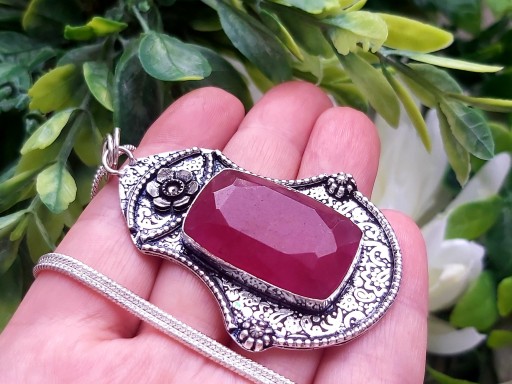 Zrobiono z indyjskiego srebra(ze stopu srebra i miedzi).Centrum wisiorka zdobi oprawiony naturalny indyjski Rubin (kamień nie jest cenny). Ręczne wykonanie indyjskiego jubilera. Nowy bez metki.