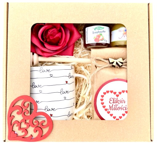 - całość zapakowana w pudełko - eko box z czerwonym serce.