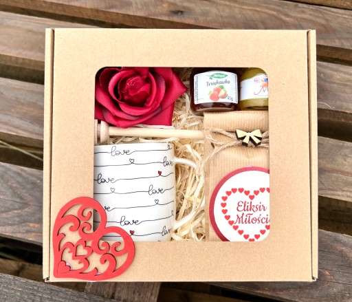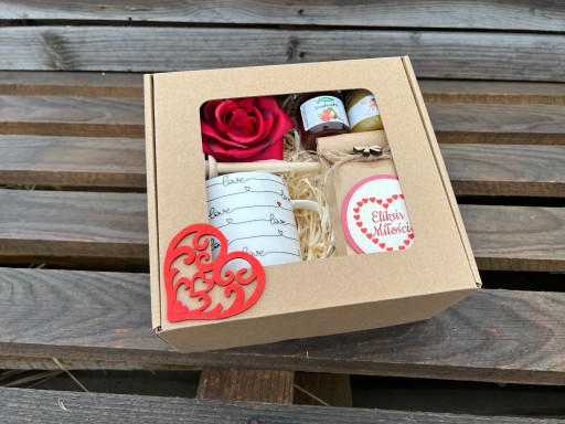 - całość zapakowana w pudełko - eko box z czerwonym serce.