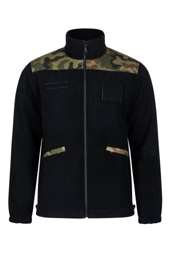 Bluza Polarowa w kolorze czarnym z naszyciami moro.Posiada dwie kieszenie głębokie zasuwane na suwaki,które umożliwiają zapakowanie niezbędnego ekwipunku.Na klatce piersiowej i na rękawach znajdują się rzepy służące do przypięcia dodatkowych naszywek i flag. W górnej części posiada wysoki kołnierz chroniący szyję przed nieprzyjaznymi warunkami atmosferycznymi. Ciepła i bardzo wygodna,znakomicie sprawdza się jako bluza do samodzielnego noszenia lub jako podpinka pod kurtkę. Nie mechaci się i nie wyciera – wykonana przez polskiego producenta.