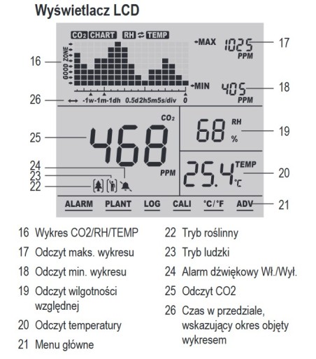 - Wskaźnik LCD wartości CO2, temperatury i wilgotności