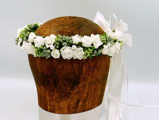 Wianek wykonany z białych różyczek piankowych, zdobiony zielonymi szyszeczkami i perłami.
