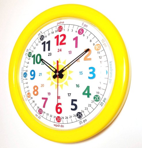 Czytelny zegar ścienny ułatwiający naukę czasu. Wyraźne oznaczenia godzin, minut, 5 po, za kwadrans, wpół do, itp. w języku polskim. Mechanizm kwarcowy, cichy. Średnica 32,5 cm. Szybka z tworzywa. Model ATE950YNC1 T4 SW. Zegar do pokoju szkoły świetlicy