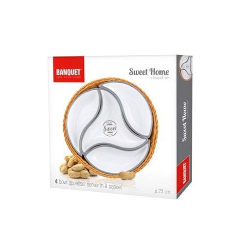 Miseczki SWEET HOME w plecionym koszu PCV o średnicy 23 cm nadają się do serwowania słonych i słodkich przysmaków oraz sosów i dipów. Zestaw zawiera: 3 x mała miska, 1 x duża miska i 1 x wiklinowy kosz z PVC.