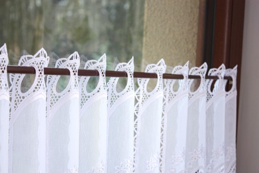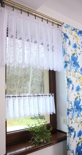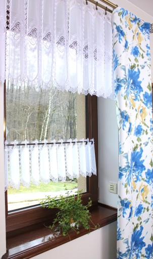 Przedmiotem sprzedaży jest firanka kuchenna typu zazdrostka o wysokości całkowitej 31 cm . Panele z tkaniny przypominającej etaminę są połączone przepięknymi aplikacjami gipiurowymi nadając niesamowitego wyglądu szykownej dekoracji okiennej . Firaneczka jest cięta z walka i nie wymaga obszywania , dodatkową zaletą jest fakt że można taką zazdrostkę powiesić również na żabkach karnisza aby pełniej ozdobić nasze okno