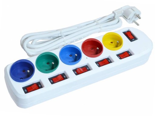 Przedłużacz listwowy, 5-gniazdowy z oddzielnymi włącznikami dla każdego gniazdka, uziemieniem oraz zabezpieczeniem przeciwprzepięciowym!