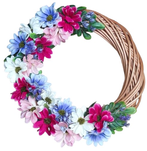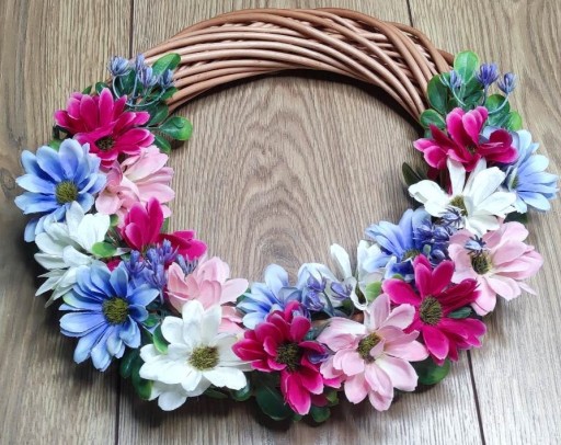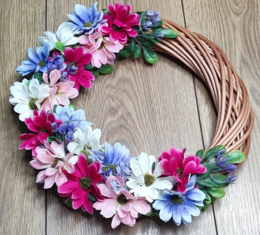 Prezentujemy śliczny wianek wiklinowy ozdobiony pięknymi sztucznymi kwiatami. Wianek został ozdobiony wysokiej jakości sztucznymi kwiatami w pięknych nasyconych kolorach. Ozdoba została wykonana ręcznie z najwyższą starannością.