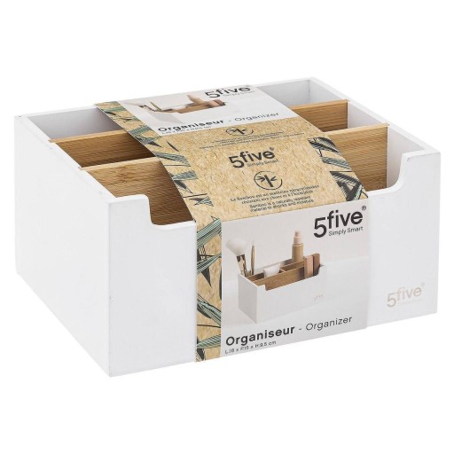 Organizer na kosmetyki pozwoli Ci wygodnie przechować różne kosmetyki oraz akcesoria kosmetyczne i higieniczne. Dzięki pięciu osobnym, wydzielonym przegrodom o różnych wymiarach podzielisz je według kategorii lub wielkości. Dodatkowym atutem prezentowanego produktu jest niewielki, kompaktowy rozmiar, dzięki czemu organizer można wygodnie postawić na półce pod lusterkiem czy w ściennej szafce.