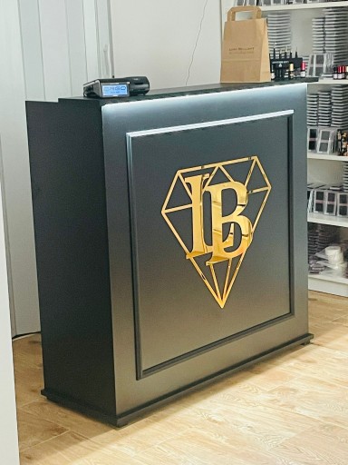 СТОЙКА РЕСЕПЕЦИИ КАССА С ЛОГОТИПОМ В ЗЕРКАЛЕ