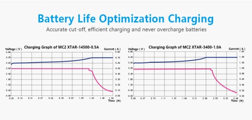Ciekawym i bezpiecznym rozwiązaniem w ładowarce MC2 Plus jest oddzielnie podłączany zasilacz. Zapobiega to niepotrzebnemu nagrzewaniu ładowanego ogniwa. Gdy zestaw pracuje nagrzewa się sam zasilacz a nie ładowane ogniwo. Dzięki temu temperatura podczas ładowania, może wzrosnąć na ogniwie nie więcej niż 15ºC. Wpływa to bezpośrednio na żywotność akumulatora.